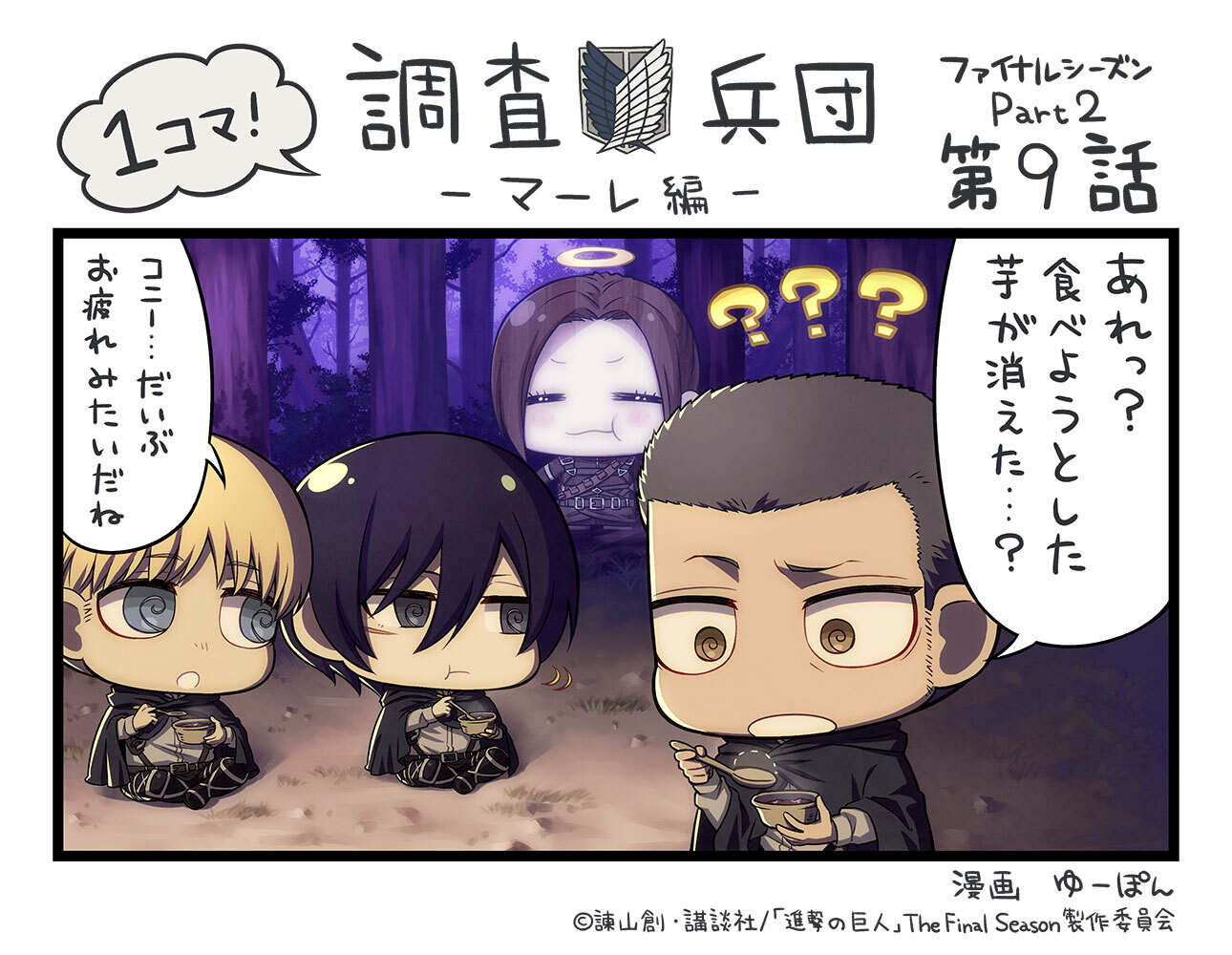 アニメ 進撃の巨人 公式アカウント ゆーぽんさん描き下ろし ちみキャラによる漫画 1コマ 調査兵団 マーレ編 The Final Season第25話 Part 2 第9話 を公開 本編の緊迫した展開とは打って変わったゆる可愛い世界観をお楽しみください Shingeki